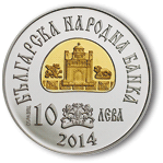 The obverse of the coin features, in a gold-plated medallion, the Golden church in Veliki Preslav (Great Preslav), a lion and a gryphon. Underneath there is the nominal value ‘10 ЛЕВА’ (BGN 10) and the logo of the Bulgarian National Bank with the year ‘1879’ inscribed on the ribbon. The inscription ‘БЪЛГАРСКА НАРОДНА БАНКА’ (Bulgarian National Bank) and the year of the issue ‘2014’ go in circumference. |