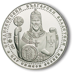 The reverse features, in an inner ring bounded by a dotted rim, an image of Tsar Simeon the Great – a detail from a stained glass window at the BNB. ‘СРЕДНОВЕКОВНИ БЪЛГАРСКИ ВЛАДЕТЕЛИ’ (Medieval Bulgarian Rulers) and ‘ЦАР СИМЕОН ВЕЛИКИ’ (Tsar Simeon the Great) are inscribed in circumference along the edge. |