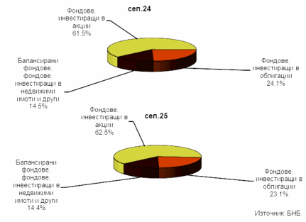 Към края на трето тримесечие на 2025 г. активите на фондовете, инвестиращи в акции, се увеличават с 320.6 млн. лева (14.4%) до 2542.1 млн. лева при 2221.5 млн. лева към септември 2024 г., а тези на балансираните фондове и фондовете, инвестиращи в недвижими имоти и други нарастват с 61.8 млн. лева (11.8%) до 584.2 млн. лева при 522.4 млн. лева към края на септември 2024 година. Спрямо юни 2025 г. активите на фондовете, инвестиращи в акции, се увеличават със 101.8 млн. лева (4.2%), а на балансираните фондове и фондовете, инвестиращи в недвижими имоти и други се увеличават с 8.5 млн. лева (1.5%). Средствата, управлявани от фондовете, инвестиращи в облигации, нарастват на годишна база с 68.8 млн. лева (7.9%) до 939.7 млн. лева към септември 2025 г. (870.8 млн. лева към края на септември 2024 г.). В сравнение с юни 2025 г. активите на фондовете, инвестиращи в облигации, нарастват с 50 млн. лева (5.6%).