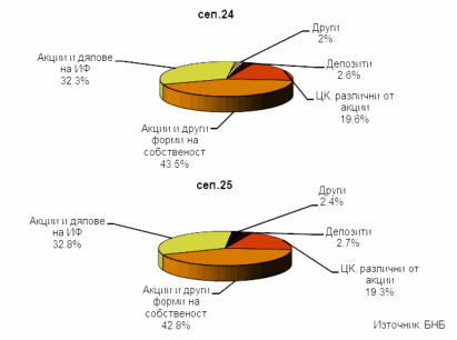 По отношение на инструментите, включени в портфейлите на местните инвестиционни фондове, към септември 2025 г. спрямо същия месец на 2024 г. инвестициите в акции и други форми на собственост се увеличават със 168.1 млн. лева (10.7%) до 1738.8 млн. лева, тези в акции/дялове на ИД и ДФ се увеличават със 165.3 млн. лева (14.1%) до 1334 млн. лева, а средствата, вложени в ценни книжа, различни от акции, нарастват със 76.7 млн. лева (10.8%) до 785.6 млн. лева. В сравнение с юни 2025 г. инвестициите в акции и други форми на собственост се увеличават с 42.6 млн. лв. (2.5%), тези в акции/дялове на ИД и ДФ – с 62.1 млн. лв. (4.9%), а средствата вложени в ценни книжа, различни от акции се увеличават с 31.7 млн. лева (4.2%). Към края на септември 2025 г. най-големи относителни дялове в общата стойност на активите имат акциите и другите форми на собственост – 42.8%, следвани от акции/дялове на ИД и ДФ – 32.8% и ценни книжа, различни от акции – 19.3%, при съответно 43.5% за акциите и другите форми на собственост, 32.3% за акции/дялове на ИД и ДФ и 19.6% за ценни книжа, различни от акции към края на септември 2024 година. Към юни 2025 г. най-големи относителни дялове в общата стойност на активите също имат акции и други форми на собственост – 43.4%, следвани от акции/дялове на ИД и ДФ – 32.6% и ценни книжа, различни от акции – 19.3%.