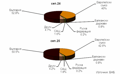 Географската структура на ценните книжа6 в активите на местните инвестиционни фондове показва, че към септември 2025 г. инвестициите в България се увеличават на годишна база със 127.4 млн. лева (7%) до 1946.8 млн. лева при 1819.4 млн. лева към края на септември 2024 г., а в останалите държави от Европейския съюз6 – с 266.1 млн. лева (19.3%) до 1644.4 млн. лева при 1378.3 млн. лева към края на септември 2024 година. В сравнение с юни 2025 г. инвестициите в България се увеличават с 29.2 млн. лева (1.5%), а в останалите държави от Европейския съюз – със 105.1 млн. лева (6.8%). Относителният дял на активите на инвестиционните фондове в ценни книжа, емитирани от резиденти е 50.5% към септември 2025 г. при 52.8% към края на септември 2024 г. и 51.5% към юни 2025 година. Относителният дял на активите на инвестиционните фондове в ценни книжа, емитирани от резиденти на останалите държави от Европейския съюз към септември 2025 г. е 42.6% при 40% към края на септември 2024 г. и 41.4% към юни 2025 година.