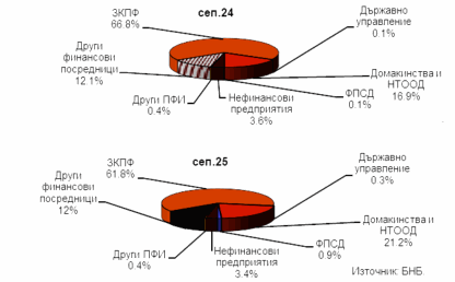 По институционални сектори към края на трето тримесечие на 2025 г. задълженията на чуждестранните инвестиционни фондове към сектор Застрахователни компании и пенсионни фондове се увеличават с 397.9 млн. лева (7.9%) до 5406.7 млн. лева при 5008.8 млн. лева към септември 2024 година. Пасивите към сектор Домакинства и нетърговски организации, обслужващи домакинства, се увеличават с 584.8 млн. лева (46.3%) до 1849.2 млн. лева към септември 2025 г. при 1264.4 млн. лева към края на трето тримесечие на 2024 година. Спрямо юни 2025 г. пасивите на чуждестранните инвестиционни фондове към сектор Застрахователни компании и пенсионни фондове нарастват с 308.6 млн. лева (6.1%), а задълженията към сектор Домакинства и нетърговски организации, обслужващи домакинства нарастват със 155.6 млн. лева (9.2%). Основни инвеститори в чуждестранните инвестиционни фондове към края на септември 2025 г. са Застрахователните компании и пенсионните фондове (61.8%) и Домакинствата и нетърговските организации, обслужващи домакинствата (21.2%). Към края на септември 2024 г. относителните дялове на двата сектора са съответно 66.8% и 16.9%, а към юни 2025 г. – 62.3% и 20.7%.