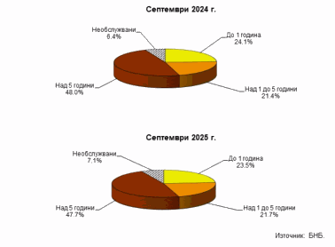 В матуритетната структура преобладават кредитите над 5 години, които са 3.569 млрд. лв. в края септември 2025 година. Те нарастват със 17.7% (537.6 млн. лв.) спрямо края на септември 2024 г. и с 4.4% (151 млн. лв.) в сравнение с края на юни 2025 година. Относителният дял на тези кредити в общия размер на вземанията по кредити намалява от 48% в края на септември 2024 г. до 47.7% в края на същия месец на 2025 година. В края на третото тримесечие на 2025 г. вземанията по кредити с матуритет над 1 до 5 години са 1.623 млрд. лева. Те нарастват с 20% (270.2 млн. лв.) на годишна база и с 10.4% (153.2 млн. лв.) в сравнение с края на второто тримесечие на 2025 година. Вземанията по кредити с матуритет до 1 година са 1.760 млрд. лв. в края на септември 2025 г., като нарастват с 15.5% (235.7 млн. лв.) спрямо края на същия месец на 2024 г., и с 6.8% (112.3 млн. лв.) в сравнение с края на второто тримесечие на 2025 година. Към края на септември 2025 г. размерът на необслужваните кредити3 е 528.7 млн. лева. Те нарастват с 30.7% (124.1 млн. лв.) в сравнение с края на септември 2024 г. и с 0.4% (1.9 млн. лв.) спрямо края на юни 2025 година.
