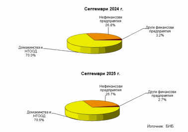 Вземания по кредити от резиденти по институционални сектори. В края на септември 2025 г. вземанията по кредити от сектор Домакинства и НТООД нарастват на годишна база с 19.6% (849.5 млн. лв.) до 5.179 млрд. лева. Спрямо края на юни 2025 г. те се увеличават с 6.3% (305.7 млн. лв.). Относителният им дял в общия размер на вземанията по кредити от резиденти нараства от 70% в края на септември 2024 г. до 70.6% в края на същия месец на 2025 година. Вземанията по кредити от сектор Нефинансови предприятия са 1.959 млрд. лв. към края на третото тримесечие на 2025 година. Те се увеличават с 18.1% (300.3 млн. лв.) в сравнение с края на септември 2024 г. и с 8.5% (153.4 млн. лв.) спрямо края на юни 2025 година. Относителният им дял в общия размер на вземанията по кредити от резиденти намалява от 26.8% в края на септември 2024 г. до 26.7% в края на същия месец на 2025 година.
