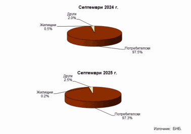 В структурата на вземанията по кредити от сектор Домакинства и НТООД преобладават потребителските кредити, които са 5.039 млрд. лв. в края на третото тримесечие на 2025 година. Те се увеличават с 19.4% (817.9 млн. лв.) на годишна база и с 6.7% (318 млн. лв.) спрямо края на юни 2025 година. Относителният им дял в общия размер на вземанията по кредити от сектор Домакинства и НТООД намалява от 97.5% към края на септември 2024 г. до 97.3% към края на същия месец на 2025 година. Размерът на жилищните кредити в края на третото тримесечие на 2025 г. е 11.9 млн. лв. Те намаляват с 44.4% (9.5 млн. лв.) в сравнение с края на септември 2024 година, а се увеличават с 10.5% (1.1 млн. лв.) спрямо юни 2025 година. Относителният дял на тези кредити в общия размер на вземанията от сектор Домакинства и НТООД намалява от 0.5% в края на септември 2024 г. до 0.2% в края на същия месец на 2025 година. Другите кредити са общо 127.7 млн. лв. в края на септември 2025 г. Те нарастват с 47.4% (41.1 млн. лв.) в сравнение с края на септември 2024 година, а намаляват с 9.5% (13.4 млн. лв.) спрямо края на юни 2025 година. Относителният им дял нараства от 2% в края на септември 2024 г. до 2.5% в края на същия месец на 2025 година.