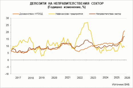 Депозитите на Нефинансови предприятия са 25.930 млрд. евро в края на януари 2026 година. В сравнение със същия месец на 2025 г. те се увеличават с 9.2% (10.2% годишно повишение през декември 2025 година). Депозитите на финансовите предприятия нарастват със 17.6% на годишна база през януари 2026 година (14.5% годишно увеличение през декември 2025 г.) и в края на месеца достигат 2.329 млрд. евро. Депозитите на Домакинства и НТООД са 55.460 млрд. евро в края на януари 2026 година. Те се увеличават с 21% спрямо същия месец на 2025 г. (19.8% годишен ръст през декември 2025 година).