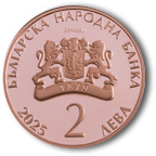 На лицевата страна на монетата: в центъра ‒ емблемата на БНБ с годината „1879“ върху лентата, околовръст горе – надпис „БЪЛГАРСКА НАРОДНА БАНКА“, а отдолу – годината на емисията „2025“ и номиналната стойност „2 ЛЕВА“. |