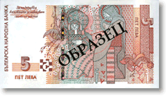 Защитни елементи Антикопирна ивица - холограмна лента: цифрата „5“, която пулсира, преливайки в различни цветове, и изображение на глава на момче и стилизирано цвете, които се редуват при промана на ъгъла на на наблюдение. Деметализиран кант на холограмната лента с минитекст „БЪЛГАРСКА НАРОДНА БАНКА 5“. Осигурителна нишка - вградена в хартията метализирана нишка с холограмен ефект - преливане на цифрата „5“ в различни зветове при промяна на ъгъл на наблюдение, съдържаща минитекст „БНБ 5“ и частично излизаща от другата страна на банкнотата; притежава и специален поляризиращ ефект. Воден знак - полутоново изображение на портрета от банкнотата; контрастно изображение на инициалите „БНБ“. Флуоресценция - на ултравиолетова светлина при 365 нм дължина на вълната: влакънцата в хартията светят в синьо, зелено и червено; на лицевата страна на банкнотата в зоната вдясно от холограмната лента ивицата от повтарящи се цифри „5“ и серийните номера светят в зелено; зоната вдясно от портрета свети в червено; на обратната страна изображенията на жената с младенеца и жетварката светят в зелено. На обратната страна на банкнотата изображение на глава на момче свети в червено при 365 нм дължина на вълната, а при 254 нм - в зелено. Регистър на проглед - правоъгълно шахматно поле, в което при поставяне срещу източник на светлина се наблюдава цифрата „5“. Микро-текст на лицевата страна - хоризонтални линии текст „ИВАН МИЛЕВ“ във фона вляво от портрета; две вертикални линии вдясно от портрета - текст „ИВАН МИЛЕВ" и текст „5 ЛЕВА“, запълващ цифрата „5“. Микро-текст на обратната страна - линии с текст "ИВАН МИЛЕВ" и „1897 1927“ оформят ивица в лявата част на основната мрежа и изпълват ръкава на жетварката; цифрата „5“ в полето под него. Скрит образ - вдясно от холограмната лента при наблюдение под ъгъл 15 - 20 градуса се появява текст „5 ЛЕВА“. Релефен печат - портретът на Иван Милев; текстовете „БЪЛГАРСКА НАРОДНА БАНКА“ и „ПЕТ ЛЕВА“; цифрата „5“, винетката и текстът „5 ЛЕВА“ върху холограмната лента. Знак за незрящи граждани - релефно изображение на два еднакви триъгълника, насочени нагоре, разположени един под друг. |