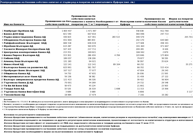 Следната таблица съдържа обобщена информация за капиталовите буфери, нетните корекции вследствие на ПКА и мерките за укрепване на капитала в банките, очаквани до 30 юни 2017 г. Банките, от които се очаква да укрепят допълнителните си капиталови буфери, вече представиха подробни планове на управление „Банков надзор“ в БНБ.