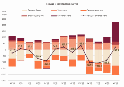 Текущата и капиталова сметка е положителна и възлиза на 197.3 млн. евро при дефицит от 271.6 млн. евро за декември 2024 г. За януари – декември 2025 г. текущата и капиталовата сметка е отрицателна и възлиза на 4044.1 млн. евро (3.5% от БВП2) при положително салдо от 396.6 млн. евро (0.4% от БВП) за януари – декември 2024 г.