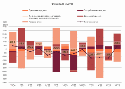 Финансовата сметка за декември 2025 г. е положителна в размер на 368.6 млн. евро при положителна стойност от 419.9 млн. евро за декември 2024 г. За януари – декември 2025 г. финансовата сметка е отрицателна – 6012.8 млн. евро (5.2% от БВП), при отрицателна стойност от 639.4 млн. евро (0.6% от БВП) за същия период на 2024 г.