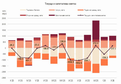 Текущата и капиталова сметка е положителна и възлиза на 177.1 млн. евро при дефицит от 26.2 млн. евро за февруари 2025 г. За януари – февруари 2026 г. текущата и капиталовата сметка е отрицателна и възлиза на 359.2 млн. евро (0.3% от БВП2) при положително салдо от 199.7 млн. евро (0.2% от БВП) за януари – февруари 2025 г.