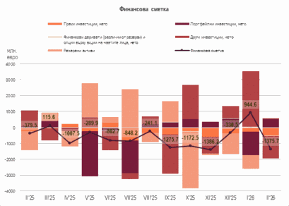 Финансовата сметка за февруари 2026 г. е отрицателна в размер на 1375.7 млн. евро при отрицателна стойност от 379.5 млн. евро за февруари 2025 г. За януари – февруари 2026 г. финансовата сметка е отрицателна – 431.1 млн. евро (0.3% от БВП), при отрицателна стойност от 42.6 млн. евро (0.04% от БВП) за същия период на 2025 г.