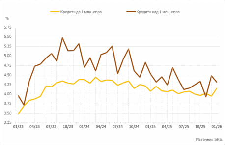Сектор Нефинансови предприятия. През януари 2026 г. в сравнение с декември 2025 г. средният лихвен процент по кредитите до 1 млн. евро се повишава с 0.20 процентни пункта (пр. п.) до 4.15%, а по кредитите над 1 млн. евро се понижава с 0.16 процентни пункта (пр. п.) до 4.32%. Средният лихвен процент по овърдрафта нараства с 0.02 пр. п. до 3.37%.