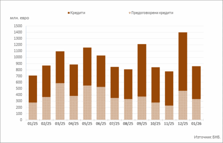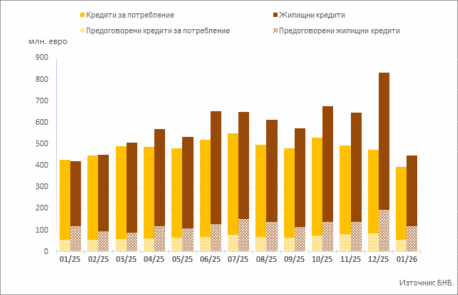 1 Пълният комплект от таблици за лихвената статистика на кредитите и депозитите на сектори Нефинансови предприятия и Домакинства, както и методологическите бележки, се намират на интернет страницата на БНБ в рубрика Статистика/Парична и лихвена статистика/Лихвена статистика. На база на постъпила допълнителна информация от банки е извършена ревизия на данните за кредитите за месец декември 2025 година. Наличието на ревизии е указано в обяснителните бележки към съответните таблици с данни.