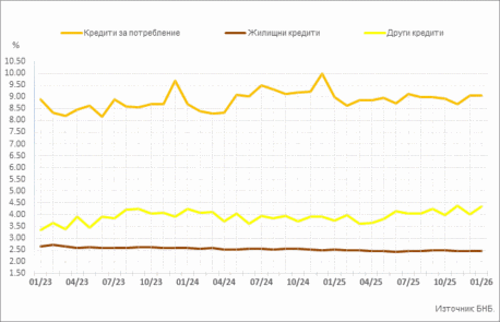 Сектор Домакинства4. През януари 2026 г. в сравнение с декември 2025 г. средният лихвен процент по кредитите за потребление и годишният процент на разходите (ГПР) по тези кредити се повишават с по 0.01 пр. п. съответно до 9.05% и 9.37%. При жилищните кредити средният лихвен процент се понижава с 0.01 пр. п. до 2.46%, а ГПР по тези кредити – с 0.11 пр. п. до 2.74%. Средният лихвен процент по другите кредити5 се увеличава с 0.33 пр. п. до 4.33%, а при другите кредити на Работодатели и самонаети лица – с 0.49 пр. п. до 4.33%. През януари 2026 г. средният лихвен процент по овърдрафта спада с 0.16 пр. п. до 13.40%, а при кредитите по кредитни карти, извън безлихвен гратисен период, нараства с 0.02 пр. п. до 21.44%.