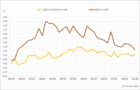 Сектор Домакинства4. През януари 2026 г. средният лихвен процент по депозитите с договорен матуритет се увеличава с 0.09 пр. п. до 1.05%, а обемът на новия бизнес по тези депозити се понижава с 15.2% (71.9 млн. евро) до 402.1 млн. евро. Средният лихвен процент по овърнайт депозитите остава на ниво от 0.01%, а този по депозитите, договорени за ползване след предизвестие се повишава незначително до 0.26%.