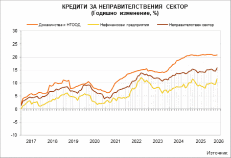 В края на март 2026 г. кредитите на неправителствения сектор нарастват с 15.8% на годишна база (14.6% годишно повишение през февруари 2026 г.) и в края на месеца достигат 63.037 млрд. евро (51.1% от БВП) при 61.961 млрд. евро (50.2% от БВП) към февруари 2026 година.
