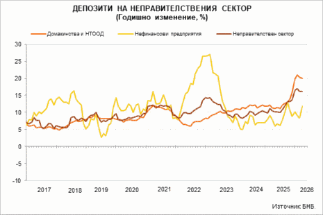 Депозитите на Нефинансови предприятия са 26.760 млрд. евро в края на март 2026 година. В сравнение със същия месец на 2025 г. те се увеличават с 11.9% (8.3% годишно повишение през февруари 2026 година). Депозитите на финансовите предприятия намаляват с 12.7% на годишна база през март 2026 година (13.4% годишно увеличение през февруари 2026 г.) и в края на месеца достигат 2.055 млрд. евро. Депозитите на Домакинства и НТООД са 55.702 млрд. евро в края на март 2026 година. Те се увеличават с 19.9% спрямо същия месец на 2025 г. (20.3% годишен ръст през февруари 2026 година).
