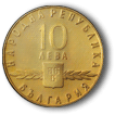 На лицевата страна на монетата в средата на два реда е изписано числото на номиналната стойност „10” и думата „ЛЕВА”. Под тях е изобразен щит с буквите „А Б В” с лаврови клонки от двете му страни. Околовръст има надписи „НАРОДНА РЕПУБЛИКА” и „БЪЛГАРИЯ”. |