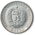 На лицевата страна на монетата в средата е изобразен държавният герб на Народна република България. Под него вляво отстрани с дребен шрифт е изписана годината на емисия „1972”. Околовръст има надпис „НАРОДНА РЕПУБЛИКА БЪЛГАРИЯ” и номиналната стойност „5 ЛЕВА”. |