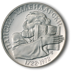 На обратната страна на монетата е изобразен Паисий Хилендарски, който държи книга с надпис на три реда „ИСТОРИЯ СЛАВЯНО БОЛ”. Под нея е разположен монограм на авторите на проекта „ПБ”. Околовръст има надписи „ПАИСИЙ ХИЛЕНДАРСКИ” и „1722-1972”. |