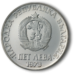 На лицевата страна на монетата в средата е разположен държавният герб на Народна република България. Под него вляво и вдясно с дребен шрифт са изписани имената на авторите на проекта „БАЛДЖИЕВ” и „КУЦАРОВ”, а хоризонтално на два реда са номиналната стойност с думи „ПЕТ ЛЕВА” и годината на емисия „1973”. Околовръст има надпис „НАРОДНА РЕПУБЛИКА БЪЛГАРИЯ”. |