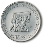 На обратната страна на монетата са изобразени стилизирани фигури на четирима въстаника на фона на развято знаме. Околовръст има надписи „СЕПТЕМВРИЙСКО АНТИФАШИСТКО ВЪСТАНИЕ” и „1923”. |