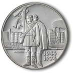 На обратната страна на монетата са изобразени български партизанин и съветски войн с вдигнати десни ръце с карабини на фона на заводи. Отдясно на композицията са изписани годините „1944-1974”, а вляво с дребен шрифт е името на автора на проекта „АЛ. ПОПЛИЛОВ”. |