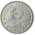 На лицевата страна на монетата в горната част е разположен венец от дъбови клонки. Вляво и вдясно от панделката с дребен шрифт са изписани монограмите на авторите на проекта „СН” и „ГЧ”. Под венеца хоризонтално са изписани годината на емисия „1976”, числото на номиналната стойност „2” и думата „ЛЕВА”. Композицията завършва с кант околовръст, а във външния пръстен има надписи „НАРОДНА РЕПУБЛИКА” и „БЪЛГАРИЯ”, разделени от две петолъчни звезди. |