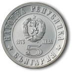 На лицевата страна на монетата в горната част е разположен държавният герб на Народна република България. Под венеца на герба вдясно с дребен шрифт е изписан монограмът на един от авторите на проекта „СН”. Отдолу хоризонтално са изписани годината на емисия „1976”, числото на номиналната стойност „5” и думата „ЛЕВА”. Композицията завършва с кант околовръст, а във външния пръстен има надписи „НАРОДНА РЕПУБЛИКА” и „БЪЛГАРИЯ”, разделени от две петолъчни звезди. |