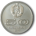 На лицевата страна на монетата в горната част е разположен държавният герб на Народна република България, под него на три реда са изписани числото на номиналната стойност „50”, думата „СТОТИНКИ” и годината на емисия „1977”. |