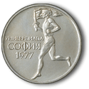 На обратната страна на монетата е изобразена фигура на тичащ спортист с факел в ръка. Вляво пред него на три реда е изписано „УНИВЕРСИАДА”, „СОФИЯ” и „1977”. |