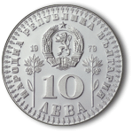 На лицевата страна на монетата в горната част е разположен държавният герб на Народна република България, като от двете му страни е изписано „19” и „79”. Под него на два реда са числото на номиналната стойност „10” и думата „ЛЕВА”, рамкирани с две цветя. Околовръст има надпис „НАРОДНА РЕПУБЛИКА БЪЛГАРИЯ” и кръг от стилизирани цветчета. |
