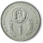На лицевата страна на монетата в горната част в кръг разположен държавният герб на Народна република България, като от двете му страни е изписано „19” и „80”. Под него на два реда е числото на номиналната стойност „1” и думата „ЛЕВ”, рамкирани с венец от лаврови клонки. Околовръст има надпис „НАРОДНА РЕПУБЛИКА БЪЛГАРИЯ”, а композицията завършва със зрънчест кръг. |