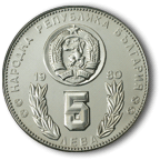На лицевата страна на монетата в горната част в кръг разположен държавният герб на Народна република България, като от двете му страни е изписано „19” и „80”. Под него на два реда е числото на номиналната стойност „5” и думата „ЛЕВА”, рамкирани с венец от лаврови клонки. Околовръст има надпис „НАРОДНА РЕПУБЛИКА БЪЛГАРИЯ”, а композицията завършва със зрънчест кръг. |