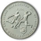 На обратната страна на монетата са изобразени двама футболисти с топка, като над главата на левия има надпис „FIFA”. Околовръст има надписи „СВЕТОВНО ПЪРВЕНСТВО ПО ФУТБОЛ” и „ИСПАНИЯ–1982”, а композицията завършва със зрънчест кръг. |