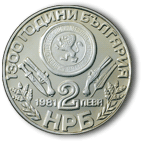 На лицевата страна на монетата в горната част е изобразен печатът на БРЦК. Около него отляво са разположени револвер и кама, а отдясно – револвер и перо. Под композицията са изписани годината на емисия „1981”, числото на номиналната стойност „2” и думата „ЛЕВА”. Околовръст има надписи „1300 ГОДИНИ БЪЛГАРИЯ” и „НРБ”, разделени от лаврови клонки. |