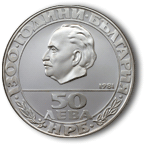 На лицевата страна на монетата в горната част е изобразен Георги Димитров, а отдолу върху хоризонтална лента е изписана годината на емисия „1981”. Под нея на два реда е числото на номиналната стойност „50” и думата „ЛЕВА”. Околовръст във външен пръстен има надписи „1300•ГОДИНИ•БЪЛГАРИЯ” и „•НРБ•”, разделени от две лаврови клонки. |