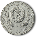 На лицевата страна на монетата в горната част е разположен държавният герб на Народна република България, рамкиран с венец от дъбови клонки, а под него е числото на номиналната стойност „5”. Околовръст има надписи „1981”, „НАРОДНА РЕПУБЛИКА БЪЛГАРИЯ” и „ЛЕВА”. Композицията завършва с външен кръг от стилизирани кръстчета. |