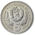 На лицевата страна на монетата в горната част е разположен държавният герб на Народна република България, рамкиран с венец от дъбови клонки, а под него е числото на номиналната стойност „5”. Околовръст има надписи „1981”, „НАРОДНА РЕПУБЛИКА БЪЛГАРИЯ” и „ЛЕВА”. Композицията завършва с външен кръг от стилизирани кръстчета. |