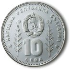 На лицевата страна на монетата в горната част е разположен държавният герб на Народна република България, като от двете му страни е изписано „19” и „82”. Под него на два реда е числото на номиналната стойност „10” и думата „ЛЕВА”, рамкирани с две лаврови клонки. Околовръст има надпис „НАРОДНА РЕПУБЛИКА БЪЛГАРИЯ” с две петолъчни звезди и зрънчест кръг. |