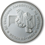 На обратната страна на монетата са изобразени футболна врата, футболна топка и сомбреро с лента, върху която има надпис „СП ИСПАНИЯ 1982” .Околовръст има надписи „XII СВЕТОВНО ПЪРВЕНСТВО ПО ФУТБОЛ” и „ИСПАНИЯ-1982”. Композицията завършва с външен зрънчест кръг. |