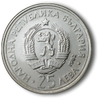 На лицевата страна на монетата в центъра е разположен държавният герб на Народна република България. Околовръст има надписи „НАРОДНА РЕПУБЛИКА БЪЛГАРИЯ” и „25 ЛЕВА”. |