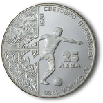 На лицевата страна на монетата е изобразен футболист с топка на фона на стилизирани флорални мотиви. Пред него на два реда е изписана номиналната стойност „25 ЛЕВА”, а над него – годината на емисията „1986”. Околовръст има надпис „СВЕТОВНО ПЪРВЕНСТВО ПО ФУТБОЛ 1986”. |