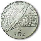 На лицевата страна на монетата на фона на флорални мотиви и футболна мрежа е изобразен футболист, който държи топка. Над него има надпис „СВЕТОВНА КУПА ПО ФУТБОЛ” и годината на емисия „1986”. Под него на два реда е изписана номиналната стойност „2 ЛЕВА”. |