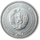На лицевата страна на монетата в центъра е разположен държавният герб на Народна република България. Околовръст има надписи: „НАРОДНА РЕПУБЛИКА БЪЛГАРИЯ”, „20 ЛЕВА”, както и годината на емисия „1988”. |