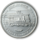 На обратната страна на монетата има изображения на парен и електрически локомотиви върху релси, а под тях е емблемата на БДЖ. Околовръст има надпис „100 ГОДИНИ БЪЛГАРСКИ ДЪРЖАВНИ ЖЕЛЕЗНИЦИ”. |