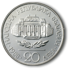 На лицевата страна на монетата е изобразена сградата на Софийския университет, а по нея – свързани маслинови клонки. Околовръст са надписите: „НАРОДНА РЕПУБЛИКА БЪЛГАРИЯ”, годината на емисия „1988” и номиналната стойност „20 ЛЕВА”. |