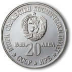 На лицевата страна на монетата е държавният герб на Народна република България, а под него са разположени годината на емисия „1988” и номиналната стойност „20 ЛЕВА”. Околовръст има надпис „ВТОРИ СЪВМЕСТЕН КОСМИЧЕСКИ ПОЛЕТ •СССР•НРБ•”. |